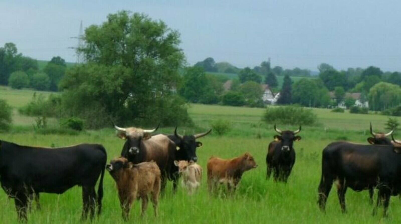 Die Heckrinder grasen in der Johannisbachaue, hinter dem Viadukt am Schildescher Obersee.