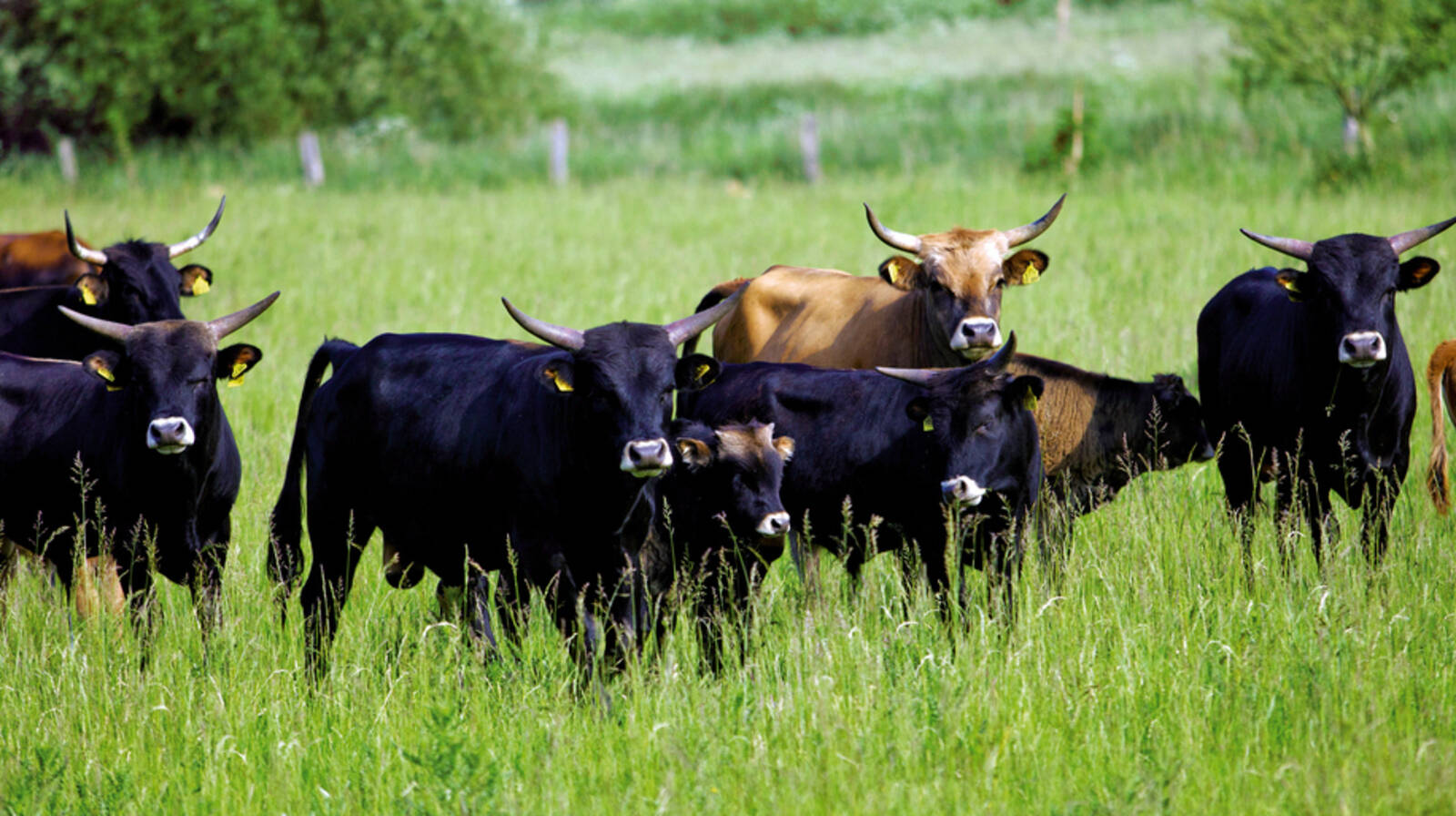 Diese robusten Wildrinder, bekannt für ihre beeindruckenden Hörner, leben im Herdenverbund mit Mutterkuhhaltung ganzjährig draußen.